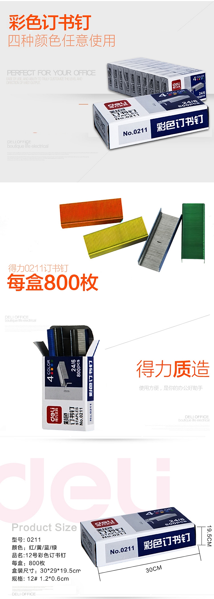 得力 0211 彩色订书钉12# 24/6 800枚/盒 (单位:盒) 混色 10盒每包