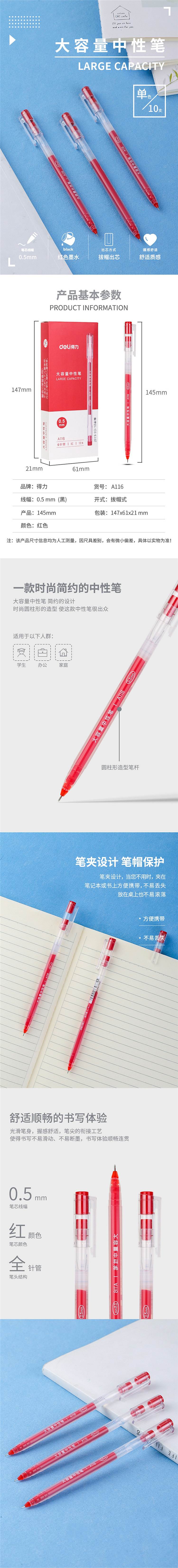 得力A116大容量中性笔0.5mm全针管(单位:支)红 144支每中包