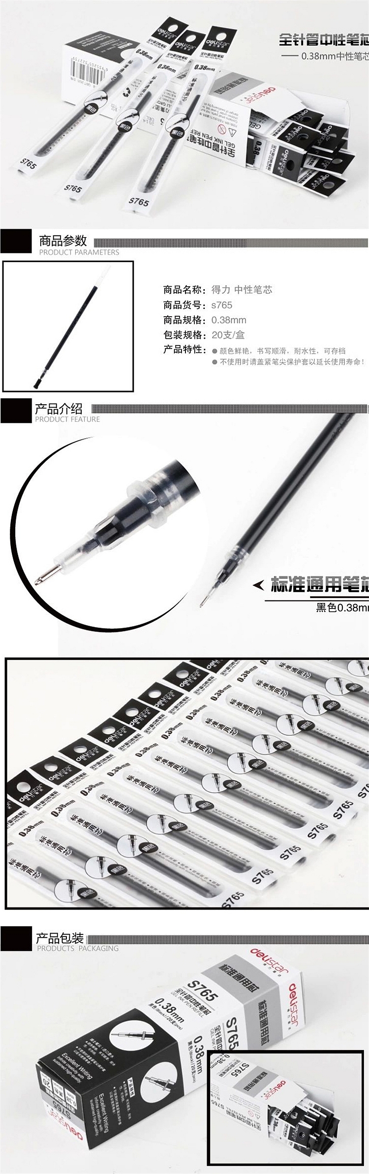 得力 S765 中性笔芯水笔芯 0.38mm 20支/盒(黑) (盒)