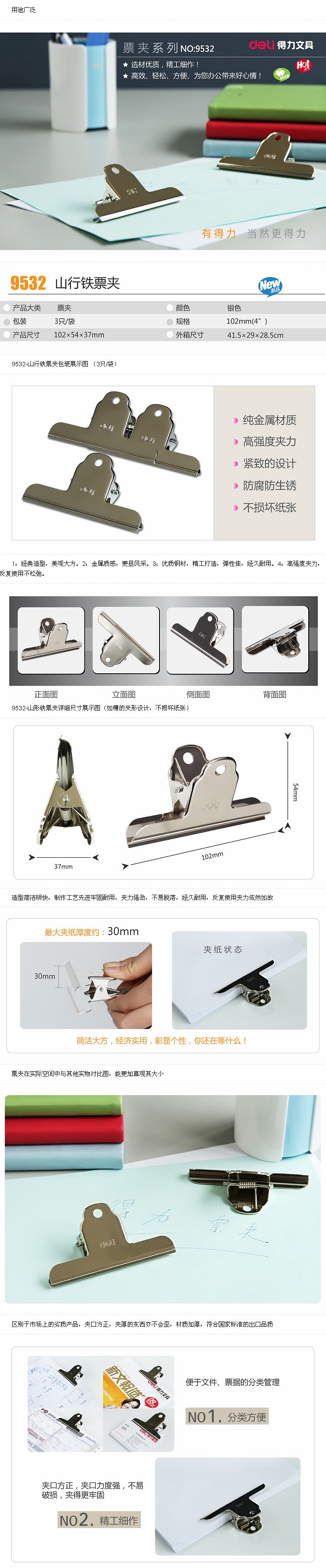 得力 9532 山形铁票夹铁夹 102mm 3只/包 (包) 0