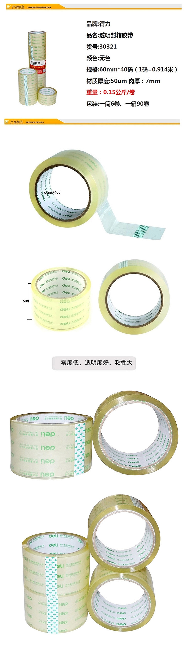 得力 30321 封箱胶带 60mmx40y 6卷/筒 (单位:筒)