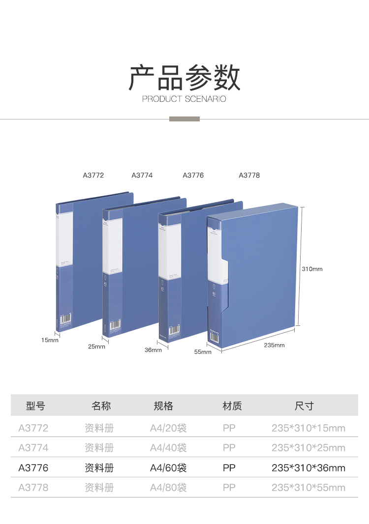 齐心 A3776 易取资料册 A4 60袋 灰蓝 单位:个