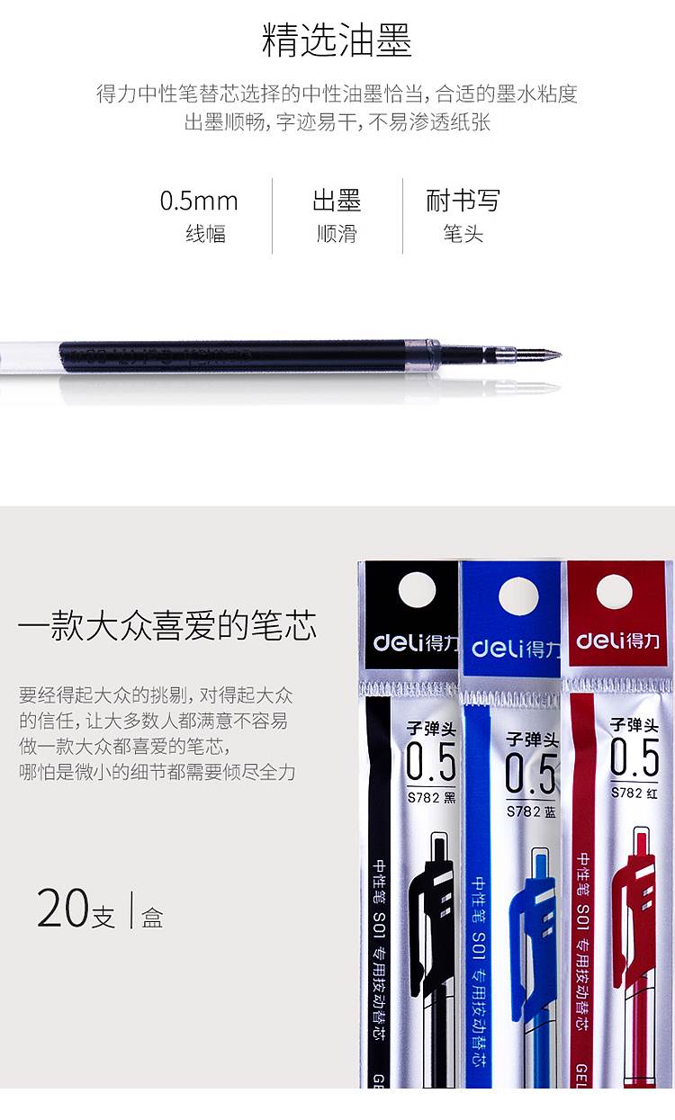 得力(deli)S782按动中性笔替芯0.5mm子弹头(单位:支)红