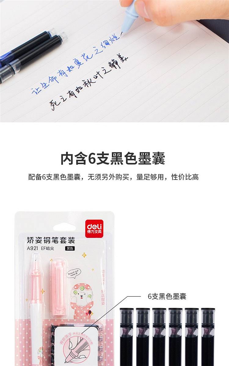 得力A921矫姿钢笔套装(黑)(6墨囊+1支笔/卡)