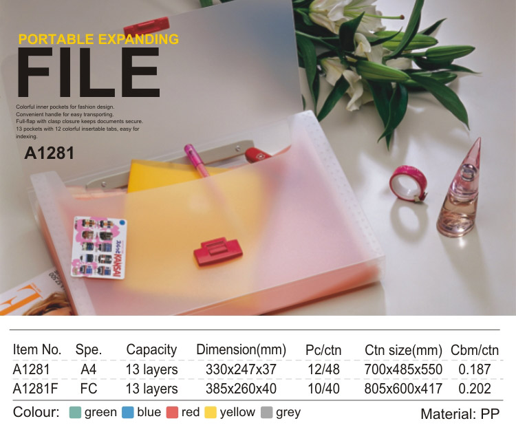 齐心外销 A1281 手提 13层透明风琴包 A4 红